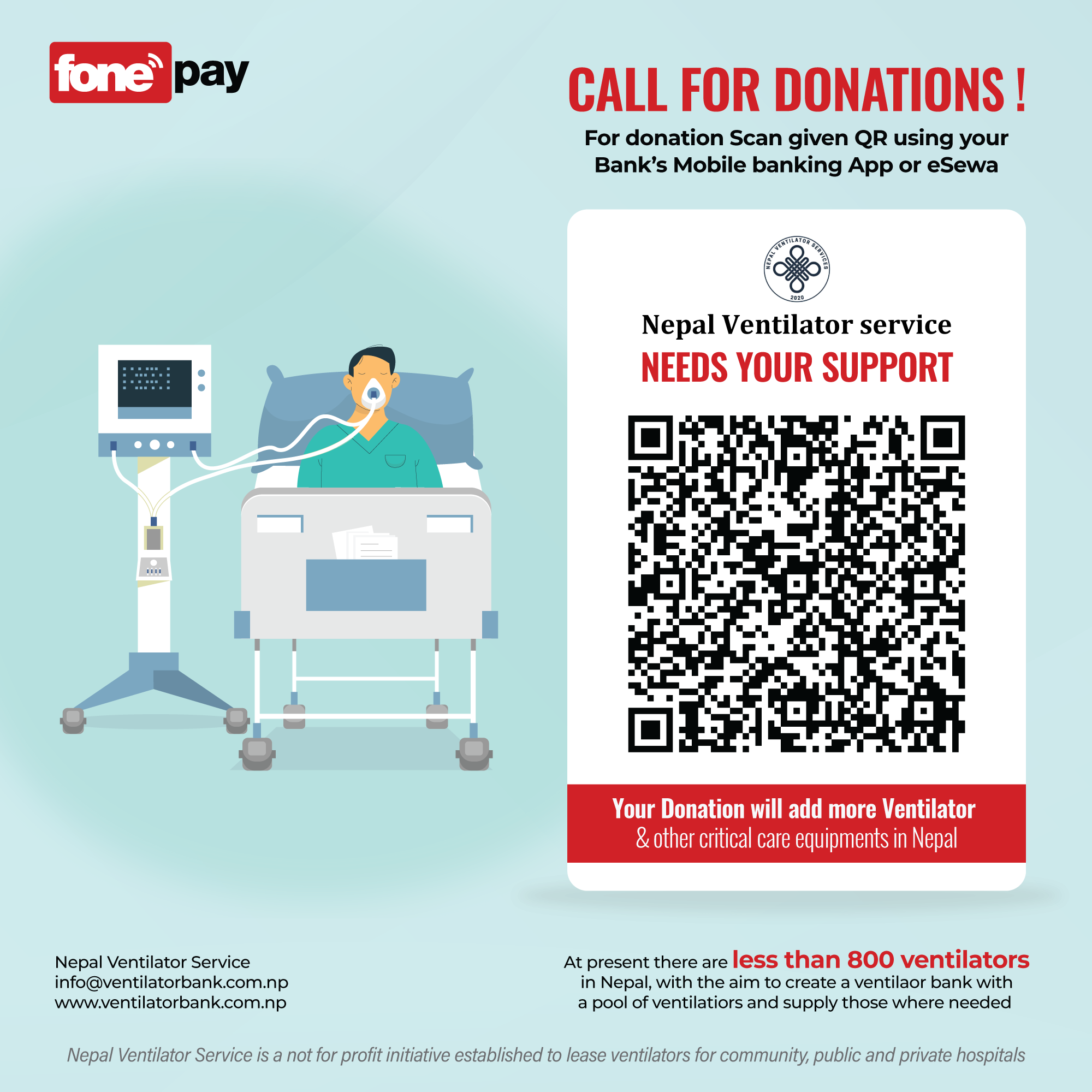 Bank Name: Laxmi Bank, Hattisar Account name: Nepal Ventilator Service Account number: 00511156762.